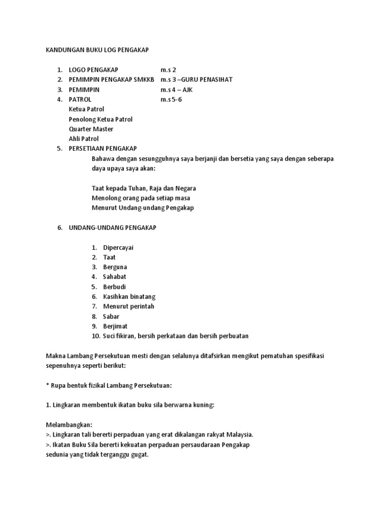BUKU LOG KANDUNGAN BUKU LOG. Satu contoh pembelajaran dalam Pengakap di semua peringkat adalah mengajar serta melatih Pengakap lain dan diri sendiri bagaimana menyediakan buku log. A Terdapat 3 kelopak pada lambang yang membawa maksud Persetiaan Pengakap iaitu- taat kepada TuhanRaja dan Negara Menolong orang setiap masa menurut undang-undang Pengakap.